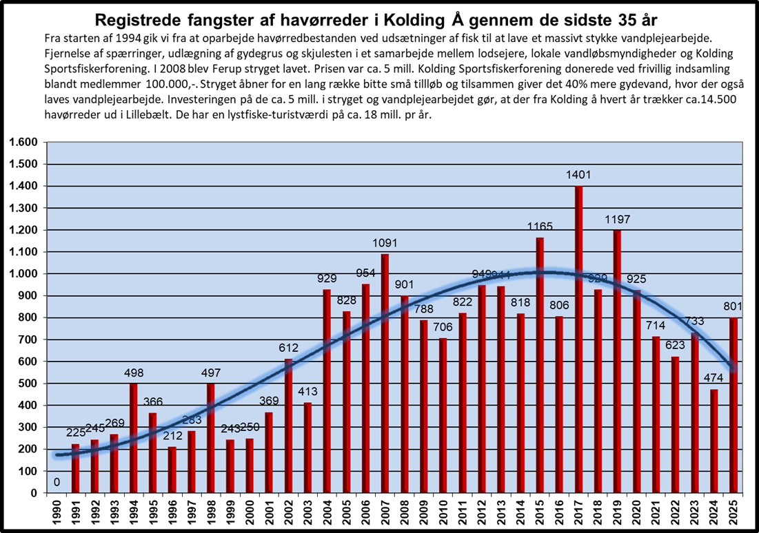 Se de årlige fangster af havørreder i Kolding fra 1991 til og med 2025. Diagram
