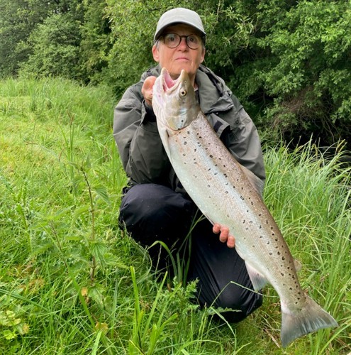 Så er det Irenes tur til at lande en rigtig fin juni havørred på 74 cm og 4,3 kg. Turen til i Påby enge med en orm var opskriften.