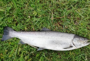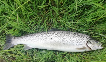 Kjeld Schmidt fik d. 15. og igen d. 17. juni en havørred på 64 cm og 3,1 kg som her ligger smukt i græsset for hans fødder.