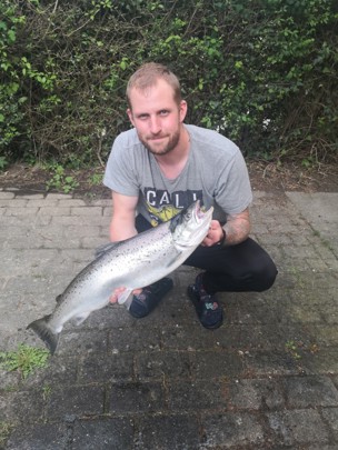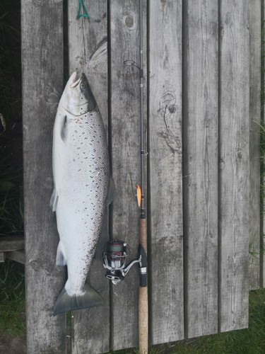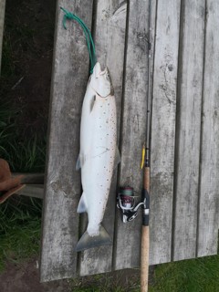 Her sad jeg så, med en KÆMPE havørred, helt sølvblank som havde rette min trekrog ud på den wobler jeg fangede den på.