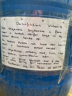 Vi har sat en beholder op med Virkon-S ved Storhytten Koldingvej 101, Vester Nebel, 6040 Egtved.