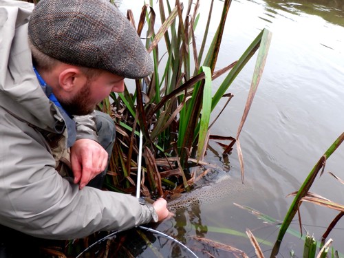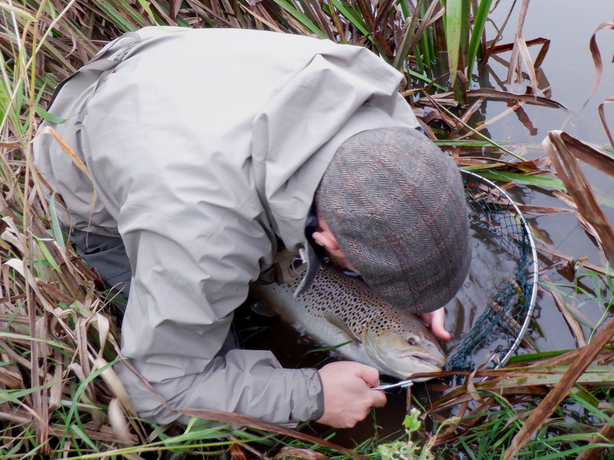 Efter at have fisket yderligere et par timer, var der endelig bud efter fluen. Den tog hårdt i egen brink, men krogen slap sit tag. Heldigvis skulle der ikke gå længe før der igen var bud efter fluen. Denne gang sælger og tog og fisk min flue ved modsatte brink og den blev siddende. Efter en rask kamp lande en fisk på 58 cm, turen var reddet og vi holdte en velfortjent frokostpause.