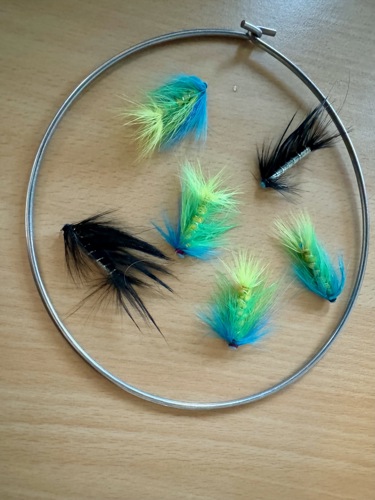 Fluegrejet blev rigget til med en gammel synkeline der har +40 års jubilæum, et stærkt forfang og en gul-grøn-blå vægtbelastet rørflue monteret med L-rig lille skarp trekrog.