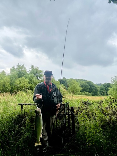 Jeg fiskede nedstrøms sammenløbet og nød at se fluen i vandet. Ud for de første træer huggede en havørred. Den var voldsomt stærk og tog nogle udløb og spring. Heldigvis var den godt kroget og efter 10 min gled den i nettet. Derefter silede det ned så T-shirt, skjorte og jakke blev gennemblødt.